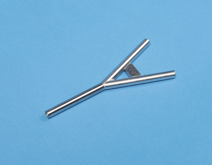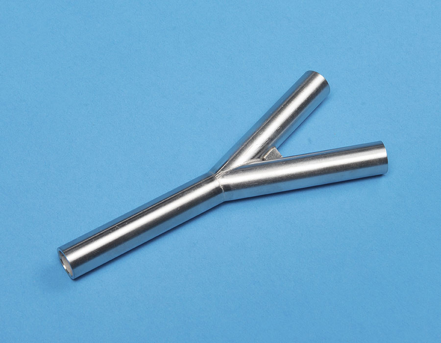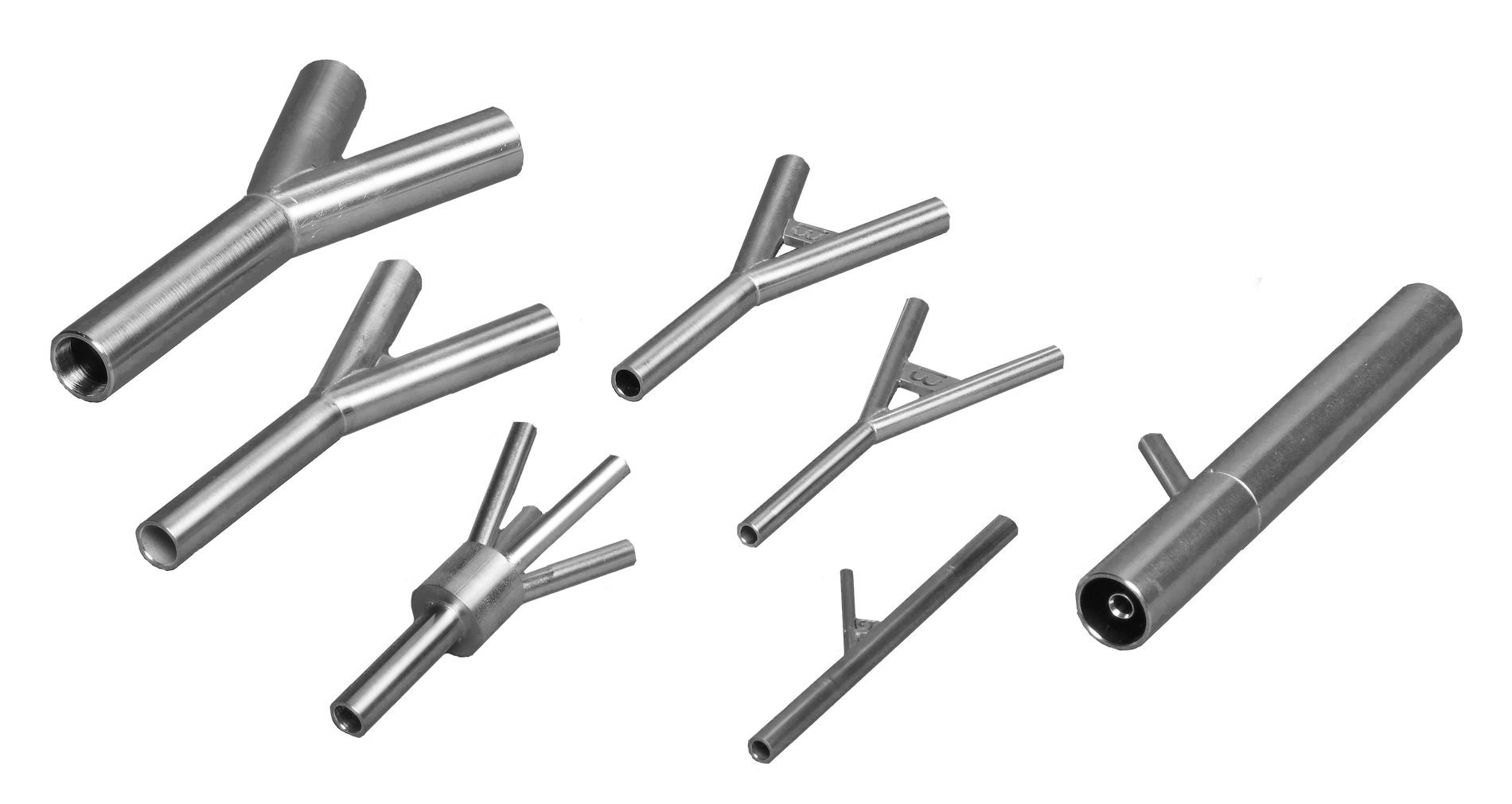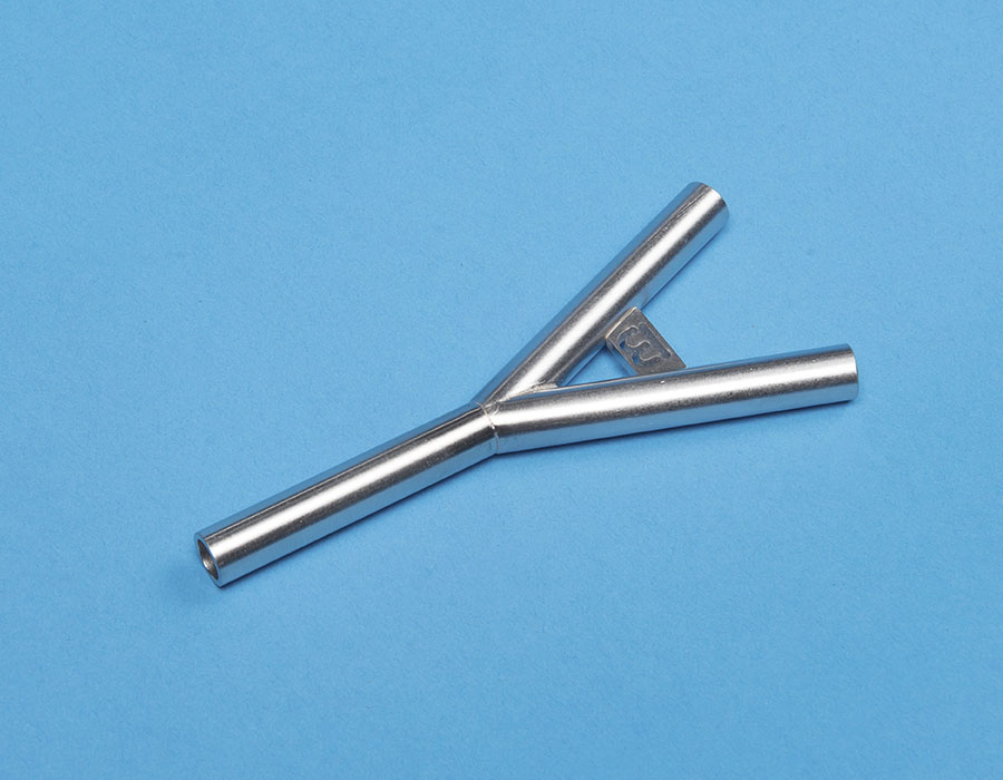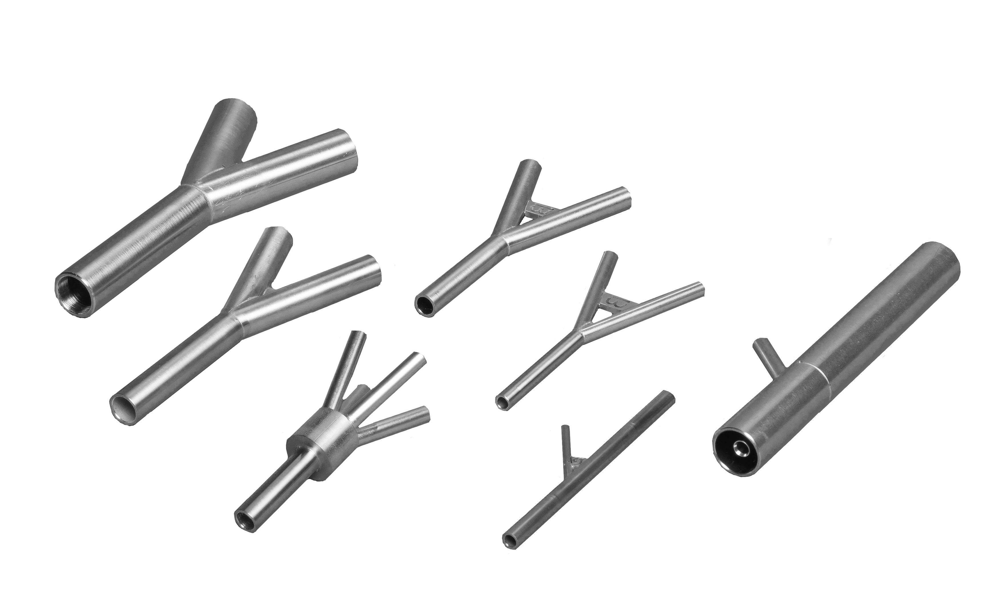 ⢠Two-way splitter design employs 2Ⳡlong legs and a 40° angle between exit tubes
